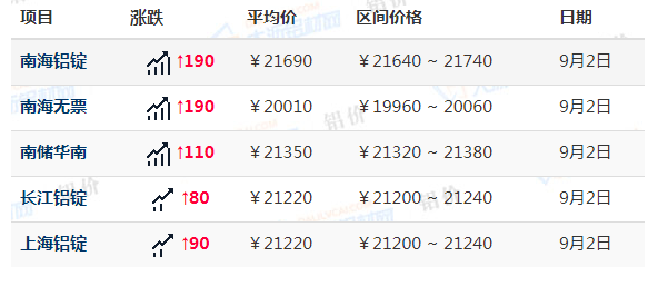 截止9月2日,鋁價格較昨日呈上下浮動趨勢,幅度波動比較大,但總體價格未有較大跌幅或者漲幅。