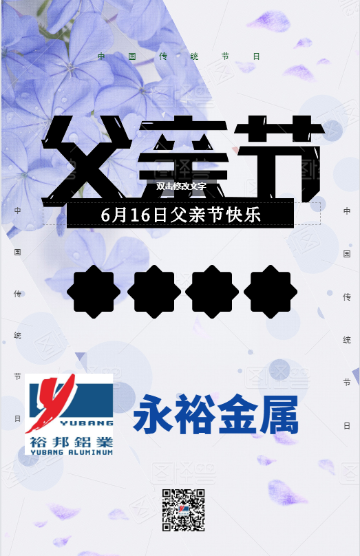 佛山市三水永裕金屬制品有限公司,16年生產(chǎn)加工鋁型材經(jīng)驗。公司有100人團隊,其中不少身為人父,是公司的中堅力量。本公司祝大家父親節(jié)快樂!